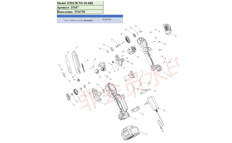Деталировка (взрыв-схема) аккумуляторная цепная мини-пила ETECH NS-18/6BL бесщеточная - поколение 2516701